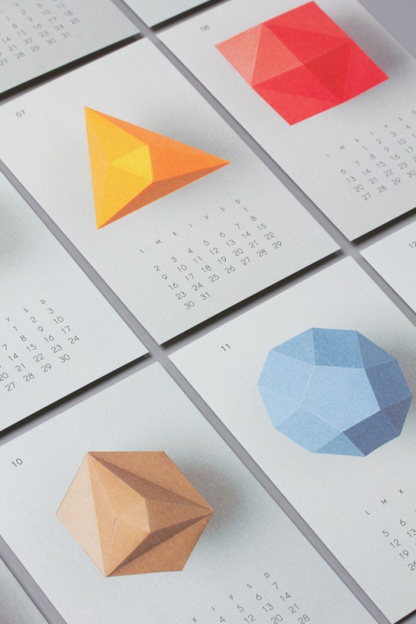 These are beautiful. Stunning. Love the shapes, love the flattened versions of the shapes, love how clean the final design is. Not sure how useful pocket calendars are since you can only tell what date is on which day of the week, and that’s the only thing you can use it for, but I still love these. Go see a few more pictures on their site. 2012 Calendar designed by Lo Siento, a studio based in Barcelona. They say on their site, Each of the polyhedrons has different number of faces, corresponding with the number or each month.